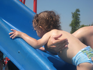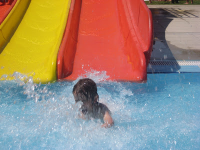 Para o minúsculo também é diversão, o pior é para mim e para o papá: não sei quantas voltas a pé dei à piscina dos 0,20m, mas foram algumas. Que piada acha ele aquilo? Para o tirar de lá foi complicado. Depois há o coloca no escorrega e ajuda a escorregar, e segurar bem ao entrar na água. Sai e entra na piscina quando ele lhe apetece. Bem, aquilo dá cabo de nós. Temos que nos ir revezando, não há hipótese.