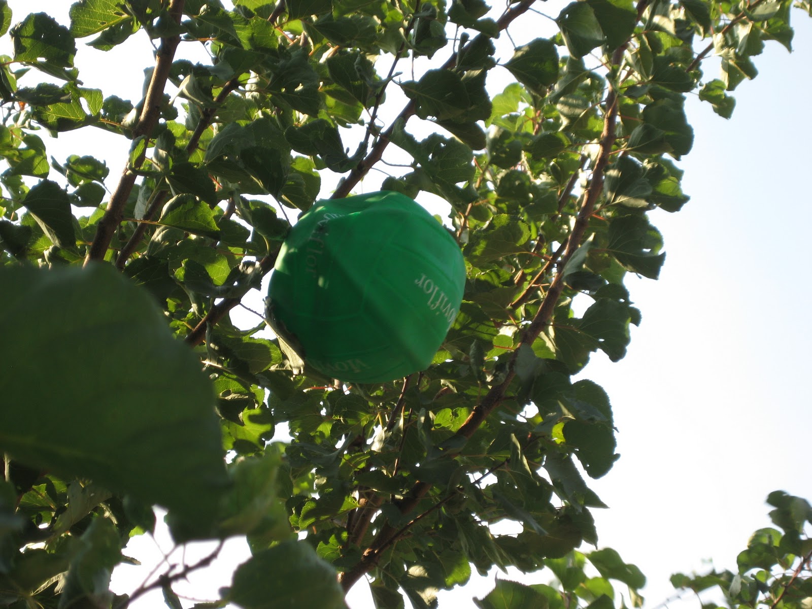 Por fim, lá uma amiga conseguiu tirar a bola da árvore, mas já estava rebentada.