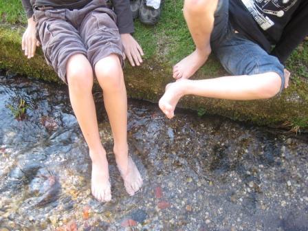 A água corria de forma límpida e bela, numa rigueira. Os príncipes ao verem aquela água, pediram logo para colocar os pés. "- Mãe, só os pés?" Mas, límpida, não representa quente. Por isso, pouco tempo aguentavam lá os pés. Logo desistiram, optando por brincar com barquinhos feitos de folhas.