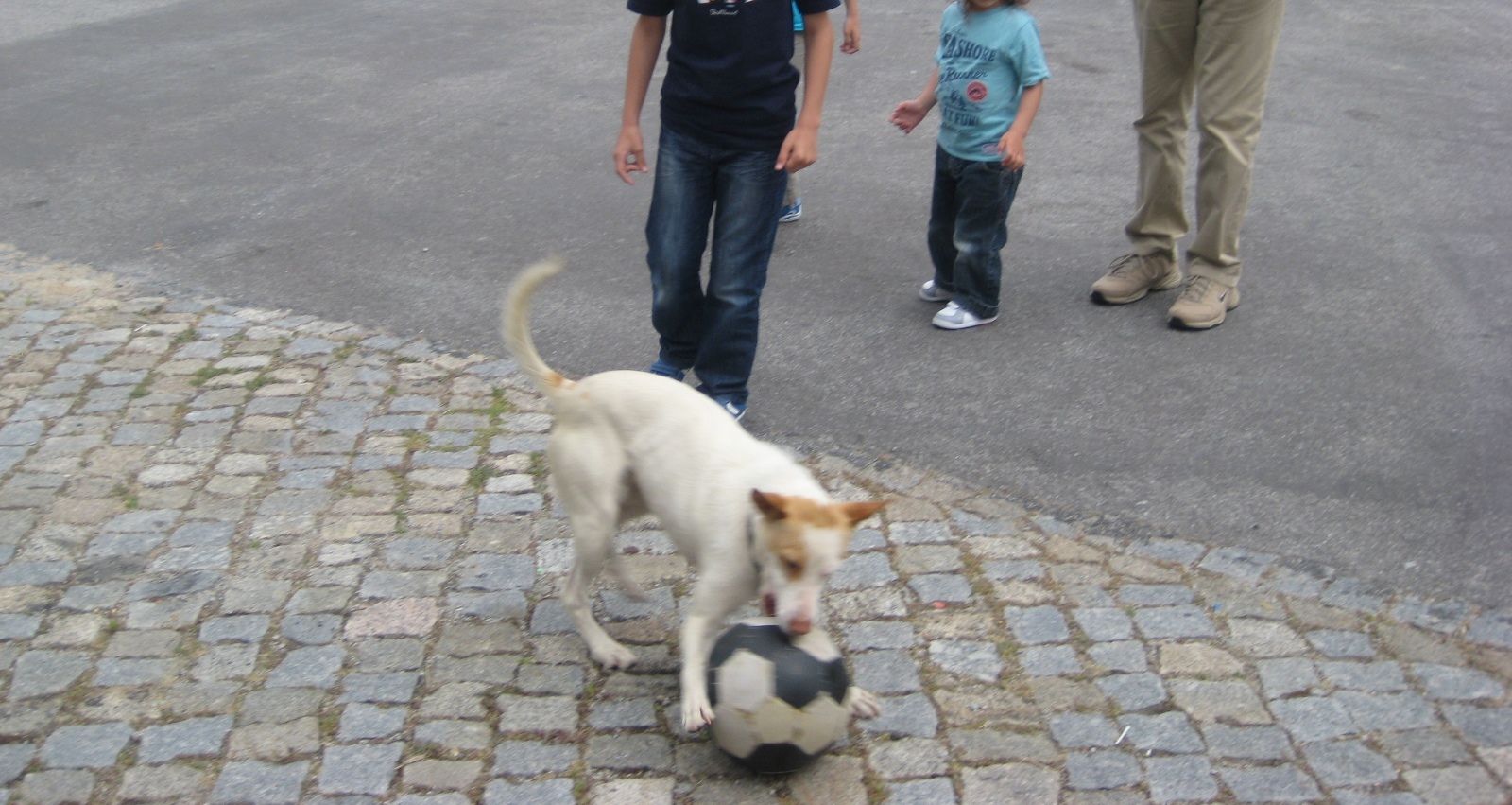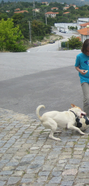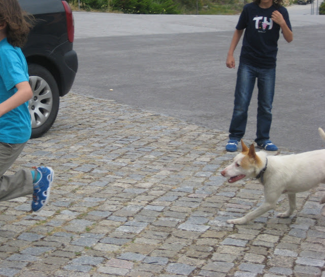 Próxima paragem: São Martinho de Mouros. A igreja românica convidou-nos a uma paragem. E, a fome também... Enquanto os miúdos comiam qualquer coisa, apareceu um canito, disposto a partilhar o lanche. O lanche e não só, a brincadeira também. Roubou-lhes a bola, saltou-lhes para cima... Bem, resultado, uns enclausuraram-se no carro, outros choraram...