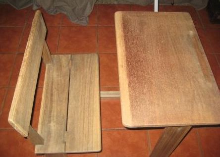 Quem não se lembra destas carteiras na escola primária? A minha tinha ferro, esta é só madeira, mas o modelo era muito próximo.