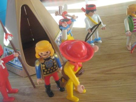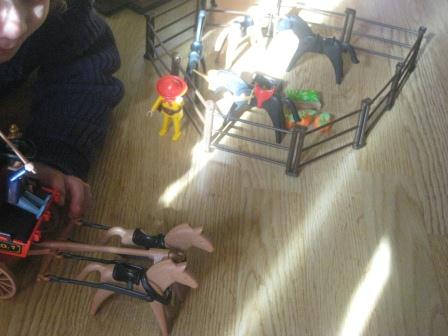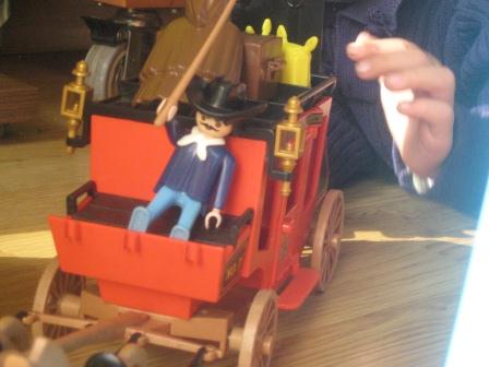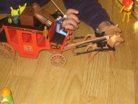 Lembrei-me dos playmobil que estavam guardados à muito tempo, ao ver o príncipe mais novo a brincar com uma boneco e um dinossauro da playmobil. Descobri-os e mostrei-lhos. Adorou logo a diligência, os cavaleiros, os cavalos. Foi vê-lo divertir-se. Parece que valeu a pena guardar estes brinquedos para o momento mais oportuno.