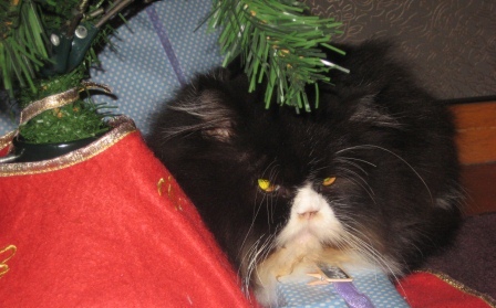 Mal fazemos a árvore de Natal, lá está o gato instalado. Será que gosta das luzes? Será que fica mais quente?