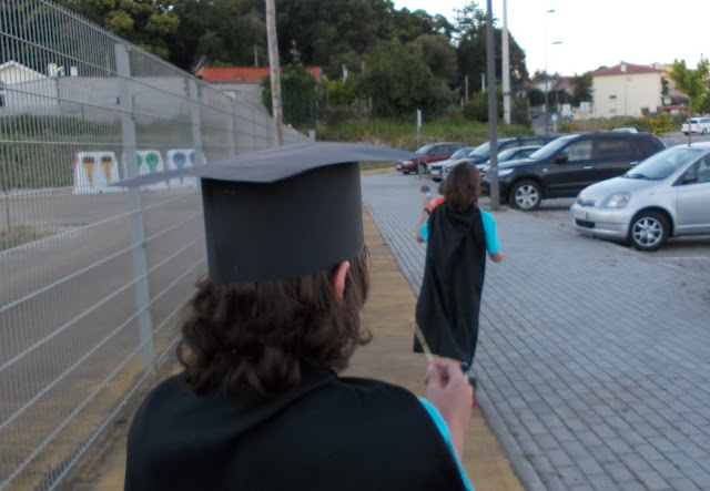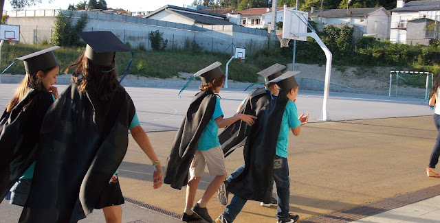 Hoje foi a festa de Finalistas dos gémeos. Ao final da tarde, num pavilhão que de tanto calor quase não se respirava, e, mais uma vez, uma festa, a perder! Parece que nunca mais aprendem: ou fazem alguma coisa de jeito ou não vale mesmo a pena. Festa de fim de ano e de finalistas, tudo junto... Quase 400 crianças num pequeno pavilhão, mais pais e familiares... Terrível!