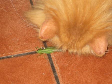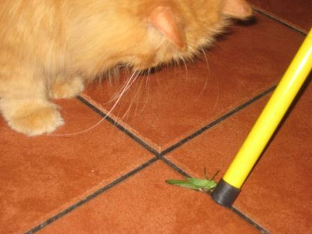 Sempre que apanha um troféu, trá-lo para casa. Enquanto o gafanhoto mexeu, foi motivo de interesse, depois abandonou-o, restando-me apanhar o bicho do chão.