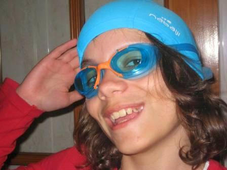 O Tiago teve ontem piscina, e como tinha toca e óculos novos, porque perdeu os anteriores, disse-me que estava ansioso pela aula para estrear a nova toca e os novos óculos.