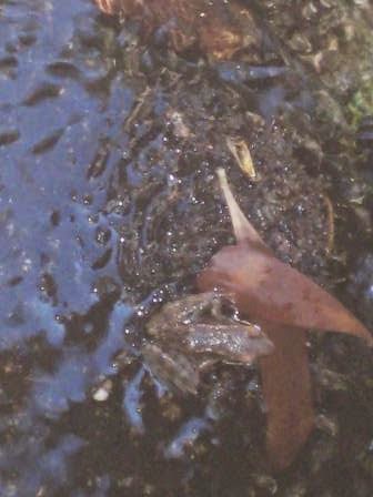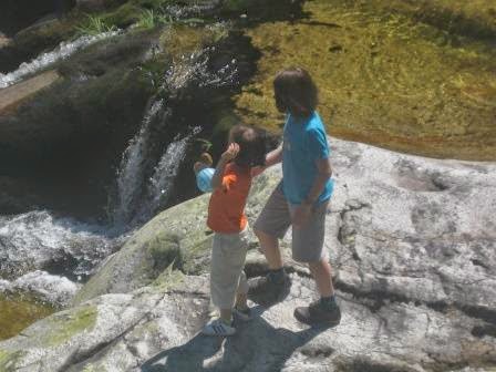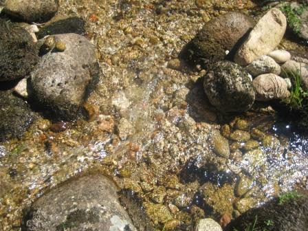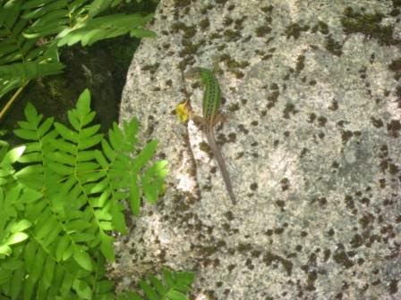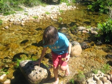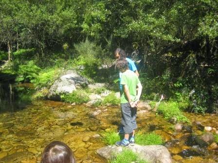 Ainda não foi desta que molharam os pés! Próxima paragem: que água tão límpida e fresca, mas muitos calhaus e só o Tiago pôs os pés realmente na água, os outros se puseram desistiram logo. Mas não foi uma paragem em vão. Vimos um lagarto-de-água, uma pequena rã e uma enorme lesma (ou que seria?).