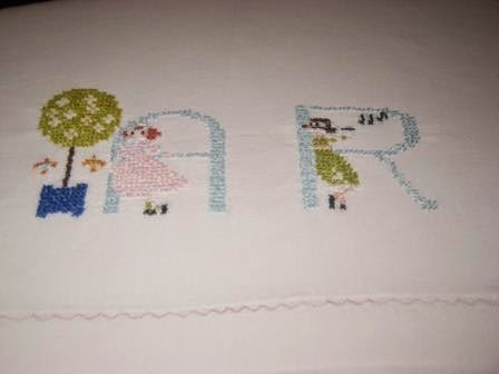 Às portas de ir para a universidade, bordei este lençol, com as minhas iniciais. Acabei por o usar só depois de casada, nas camas dos miúdos. Um dos meus muitos trabalhos em ponto-de-cruz.