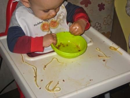 O Mini come de tudo. Tudo que vê quer provar. E, come pela própria mão (em família grande há que colocar as mãozinhas na massa!). Claro, que comer pela própria mão tem inconvenientes, tal como ficar "limpinho" no final da refeição.