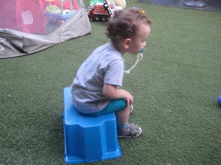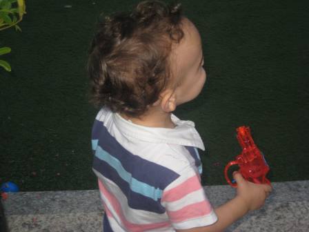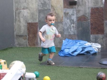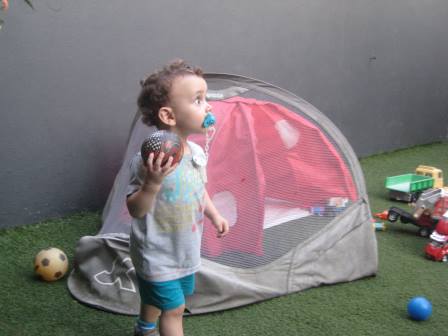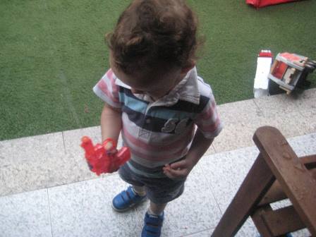 A jogar à bola. Tem bolas que gosta mais. Prefere brincar com as que gosta.