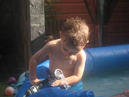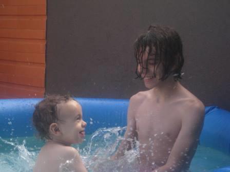 Na piscina. A nova descoberta: brincar com água.