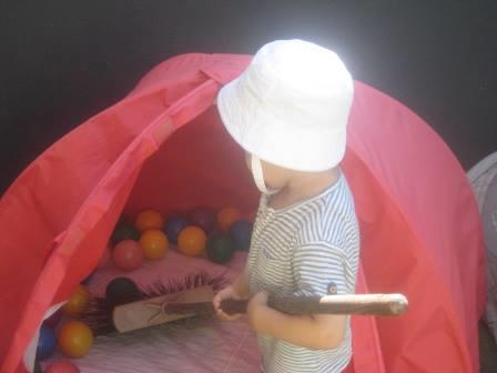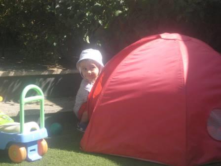 A varrer o jardim (trabalho infantil, bem sei!) e a sua tenda.