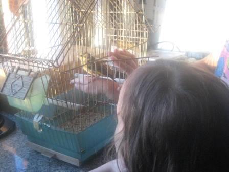 O meu marido, foi com a mãe, ver o museu do Santoinho. Viu no chão um pássaro, que parecia morto, e deu-lhe um encontrão com o pé. Eis que, o pássaro, começa a esvoaçar. Apanharam-no, arranjaram-lhe uma gaiola, e agora faz-nos companhia lá em casa. É um querido, fazemos-lhe festas, pomos as mãos na gaiola e ele salta para cima dos dedos. A nova paixão dos príncipes, principalmente dos gémeos que o adoram.