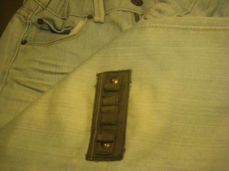 Umas calças de ganga, quase novas, com um rasgão enorme nos joelhos. Coloquei um emblema que tirei de uma peça de roupa que já não servia, e as calças estão prontas a serem usadas.