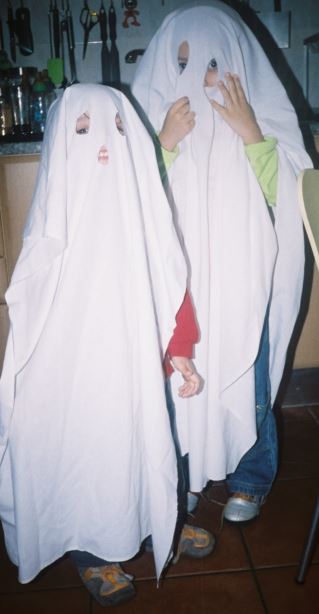 Uns velhos lençóis, e a diversão ficou completa- Em poucos minutos temos uns fantasminhas e uns rapazes felizes. Haja vontade, haja imaginação.