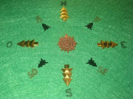 O Tiago, mais descontraído, fez algo mais simples e rápido. Diversos materiais, cola, e acabou por ter uma rosa-dos-ventos original.