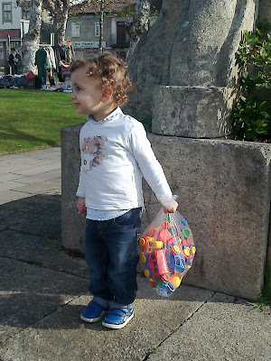 Depois de alguns dias em casa decidimos ir ao centro passear um pouco e apanhar um pouco de sol. O Mini está sempre pronto para sair. Hoje, último domingo do mês, foi dia de mercado em 2ª-mão. Caminhámos, o Mini ainda foi ao parquinho, e no fim ganhou um saco cheio de carros por 1€.