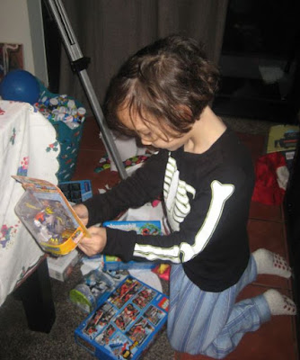 Depois das prendas desembrulhadas desaparecem, cada um vai experimentar as suas. O Mini, foi o único que ficou perto de nós, metendo os seus carros num saco e andando com eles de um lado para o outro. Também aproveitou para brincar com o novo parque de automóveis que recebeu.