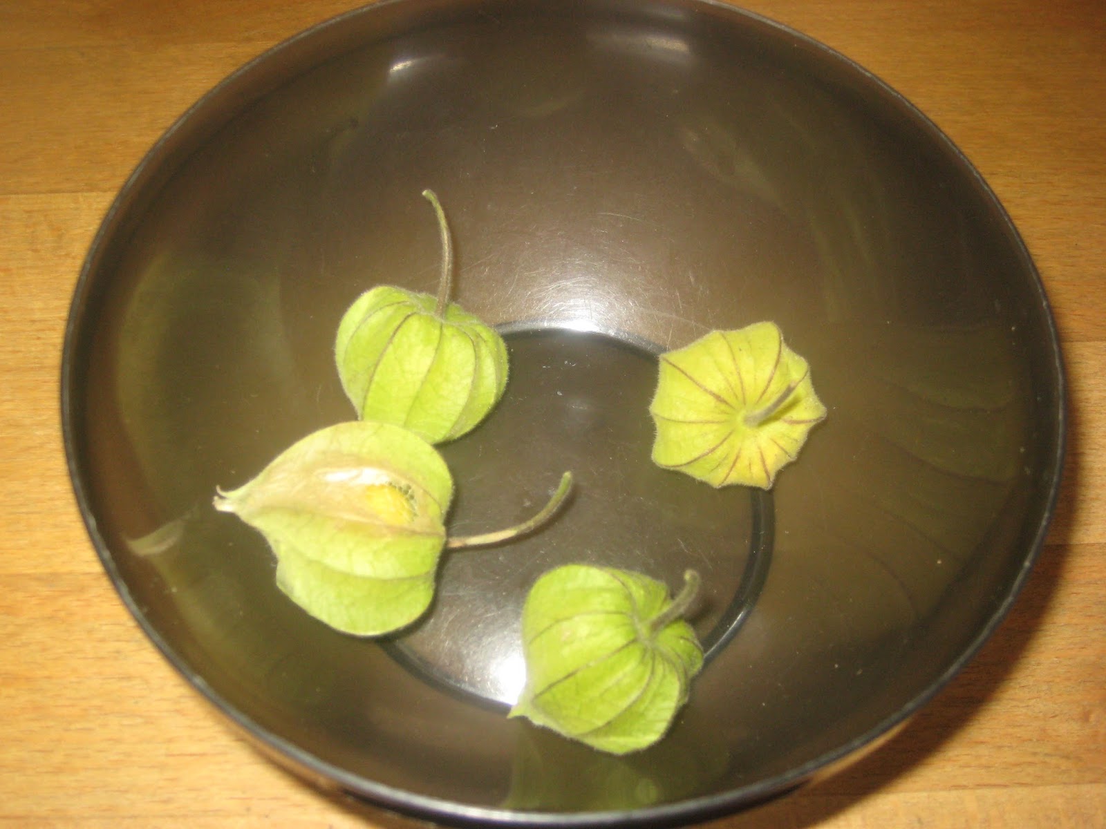 São physalis, ainda pouco amadurecidas, colhidas no pinhal. E, mesmo pouco maduras, o Mini comeu quase todas...