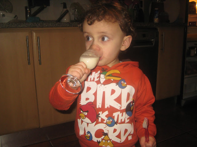 Lá está ele a beber iogurte num copo de cristal. Fino, este rapaz!