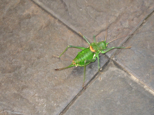 Um dia desta semana, quando estava a chegar a casa, depois de umas breves compras, o meu marido diz que viu um bicho muito estranho. Para que eu o visse, prendeu-o dentro da gaiola dos grilos. Um bicho verde, grandito (do tamanho de um gafanhoto), mas sem asas. Nunca tal tinha visto! Bem, as questões eram muitas. O meu marido queria-o libertar, mas eu não deixei que o bicharoco fosse muito mais longe... Bichos estranhos, que vêm de países tropicais é o que há mais... Este poderia bem ser um desses! Até pensei que era um daqueles que dão cabo das palmeiras... Comigo não teve hipótese de ir mais longe!