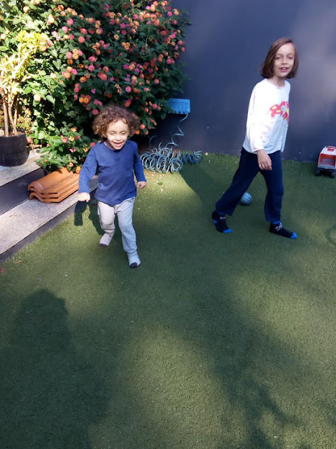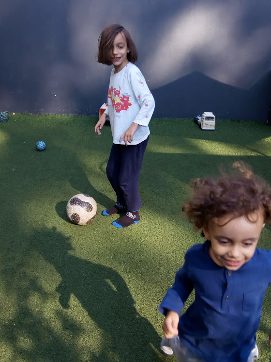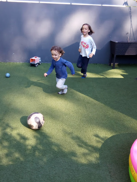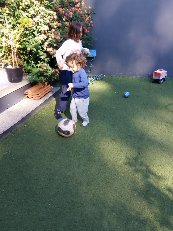 Enquanto os príncipes mais velhos foram para o Iberanime com o pai, eu fiquei com os dois príncipes mais novos. Pensei que seria uma tarde descansada, eu e o sofá, mas tive que andar com os príncipes de um lado para o outro. O Mini pediu-me para ir jogar à bola (o que eu adoro!!! ou nem por isso...), mas como recusei, pegou no comando da televisão e desligou-a. Achei-lhe tanta piada, que lá fui jogar um pouco à bola com eles.