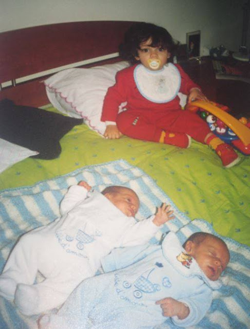 Faz 14 anos, que deixámos de ser 3 e passámos a ser 5. Em 15 minutos a nossa família aumentou. 2 pequenos seres, tão pequenos, decidiram nascer algumas semanas antes do previsto. Pequenos, mas fortes o suficiente para não ser necessário incubadora. O Tiago nasceu com 2,250kg e o João com 2,050kg.