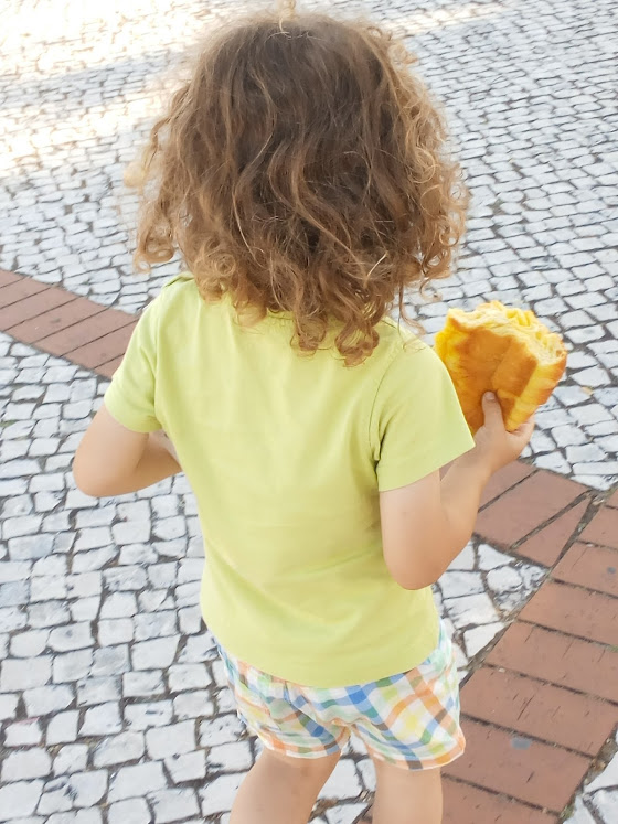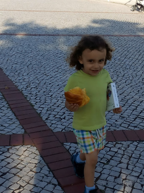 No fim, os ovos moles chamavam (chamavam, mas nem toquei!!! vontade não faltou...) Fomos a uma pastelaria, o Mini saiu de lá com um croissant enorme, mesmo ENORME, que embora tenha demorado algum tempo a comer, comeu-o todo.