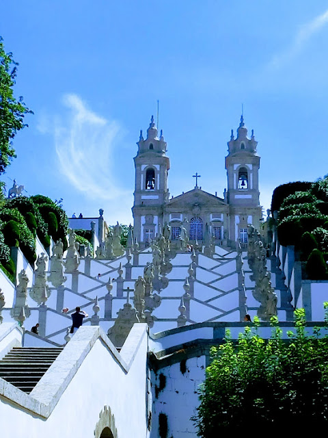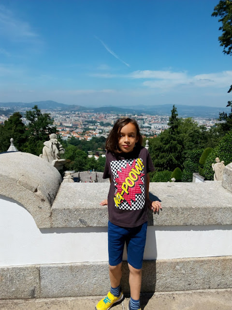 Aqui tão perto, mas mesmo perto, e onde raramente vamos, fica o Bom Jesus de Braga. Num dia de mais preguiça, que não nos apetecia viajar para muito longe, decidimos ir até lá. Os príncipes mais velhos não quiseram ir e levámos os mais pequenos. Subimos de elevador e depois descemos o escadório.