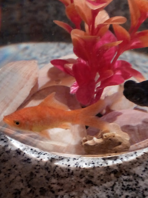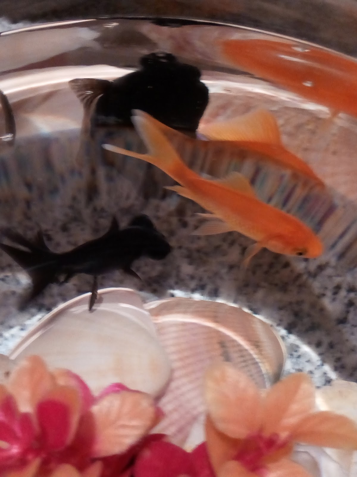 No domingo, o meu marido foi dar comida ao peixe e ele não apareceu. Incrédulo por não ver o peixe chamou-me. O peixe não estava dentro do aquário. Pensámos que um dos gatos o tinha comido, mas estava inanimado entre o microondas e a garrafeira, em cima da banca.