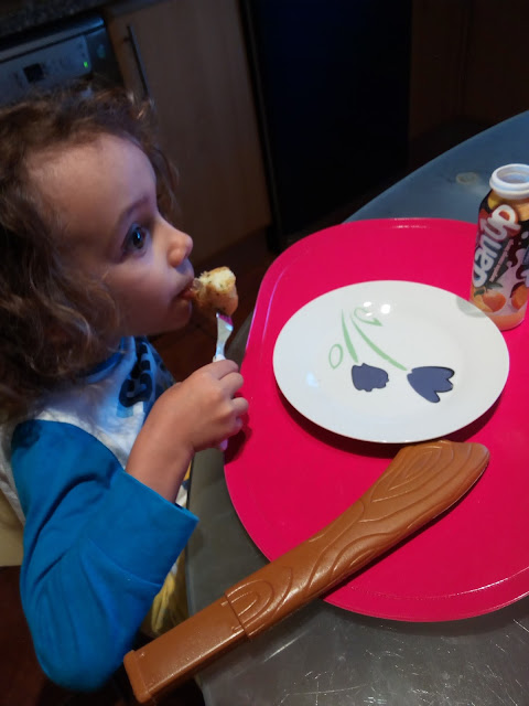 Ontem, deixei nuggets para o almoço, mais conhecidos como "franguinhos" lá em casa. O Afonso quis logo comer um de manhã.