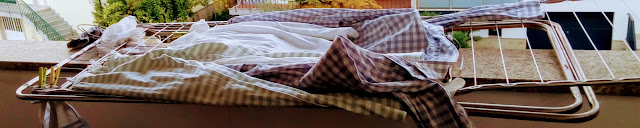 No outro dia, o estendal caiu na varanda, por ter demasiado peso de um dos lados, e o meu marido, ouvindo-me praguejar (tinha várias coisas nas mãos quando tal aconteceu), quis-me ajudar. Tão querido! Passados alguns minutos (sem praguejar e sem que o estendal tenha sido destruído!) vejo-o desistir e perguntar se aquilo era um puzzle?!?