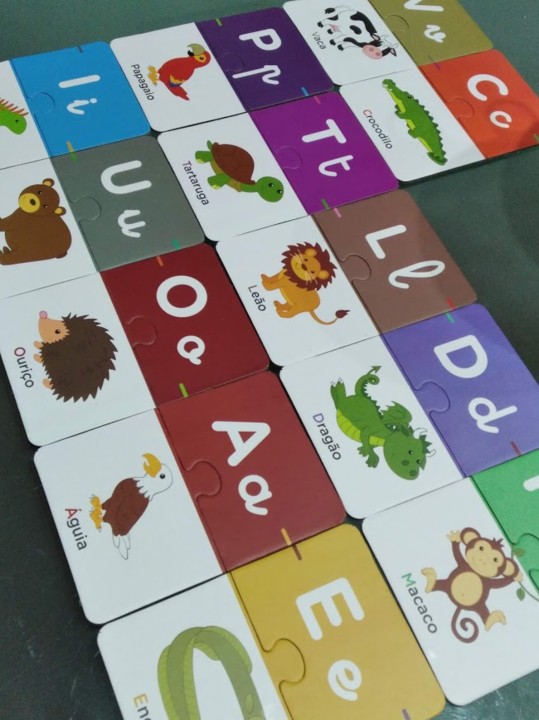 De manhã pegou no jogo que tem de letras e decidiu colocar as letras que já sabe em cima da mesa, da forma que as aprendeu.