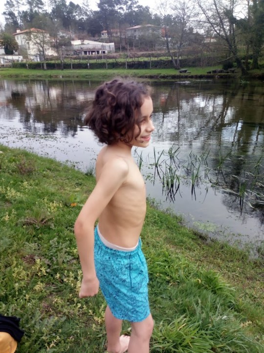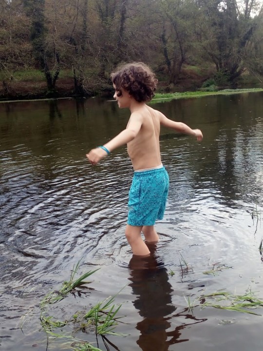 Quando chegámos à praia da Malheira quis vestir os calções e ir para o rio. Não lhe queria despir a camisola, mas ele disse que não a queria molhar. Foi para a água. A água estava gelada, mas ele foi uma vez, duas, três, quatro, ... até gelar e pedir para o vestir de novo. Nem os calções molhou, mas ficou feliz com a sua aventura em água fria.