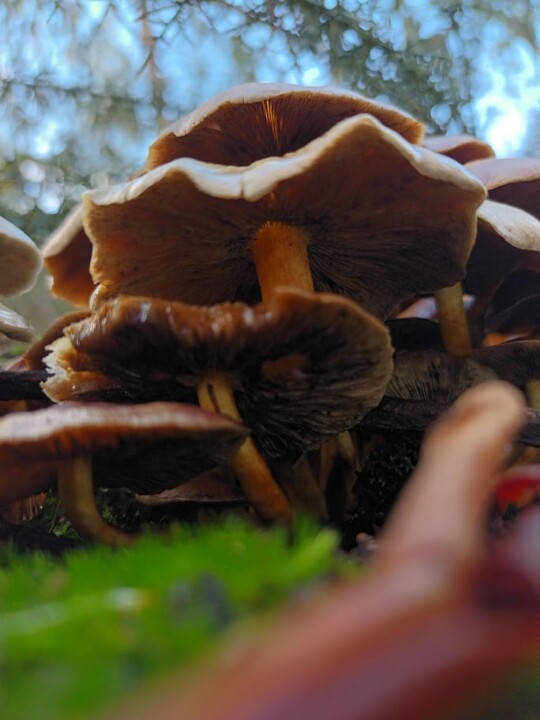 Enquanto caminhava pelo pinhal, que reflete bem a chuva e o vento dos últimos dias, vi estes belos cogumelos.