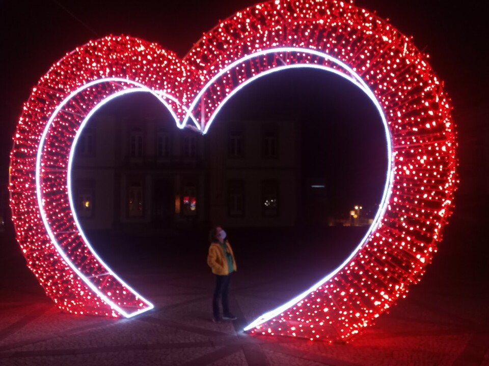 Passámos no centro da vila, e devido ao mês do Amor, colocaram um coração em frente à biblioteca (já o têm feito em anos anteriores), onde geralmente as pessoas tiram fotografias. Este ano com uma particularidade: um banco no centro do coração. Por baixo, alguns pombos passavam. Achámos piada pelos "pombinhos", tão alusivos ao amor, até que o Mini questiona: