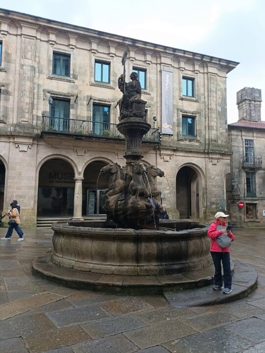 Chegámos a Santiago de Compostela caiam alguns pingos. Já junto à catedral começava a chover a sério. Abrandou um pouco e fomos visitar a catedral. Quando estávamos para sair da catedral chovia imenso. Tivemos que aguardar um bom bocado. Pelo meio dos pingos lá fomos passear nas ruas. Queríamos também conhecer a cidade.